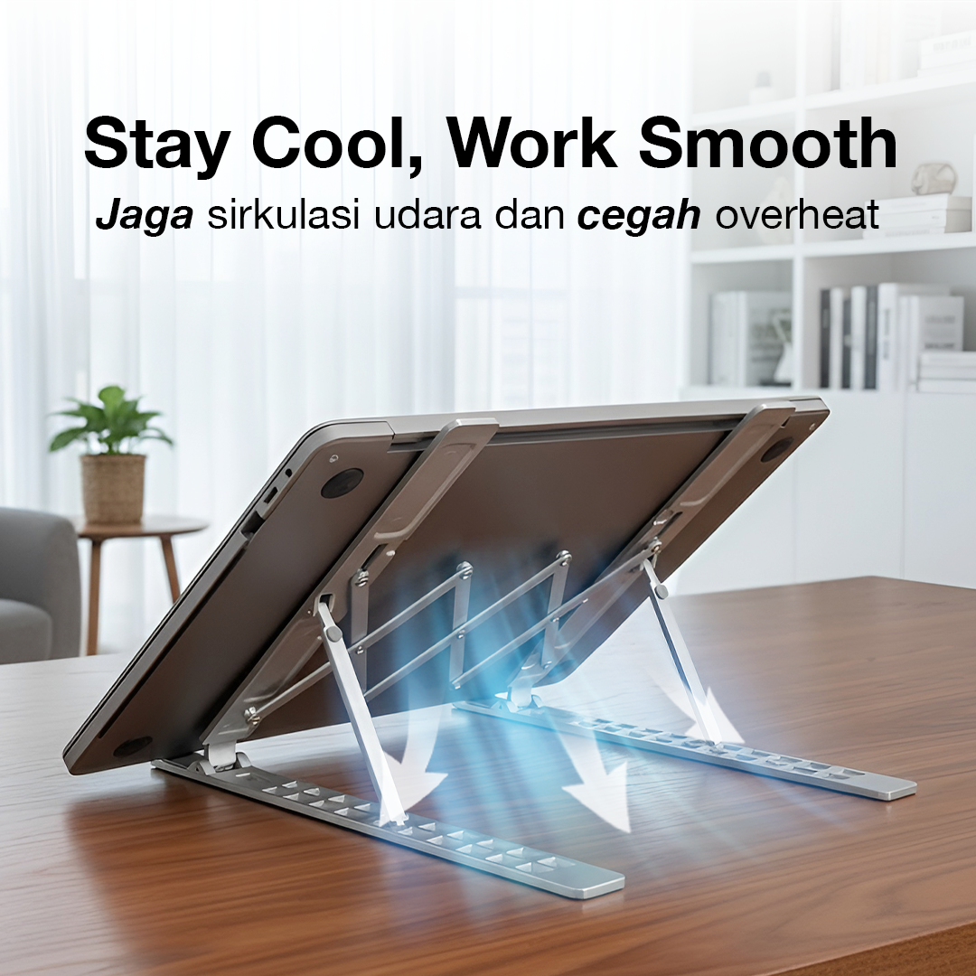 | Kerja Lancar Bebas Overheat Lubang ventilasi di bagian alas laptop stand pastikan sirkulasi udara tetap terjaga. Anda pun bisa menggunakan laptop dengan tenang tanpa khawatir lag karena overheat. |