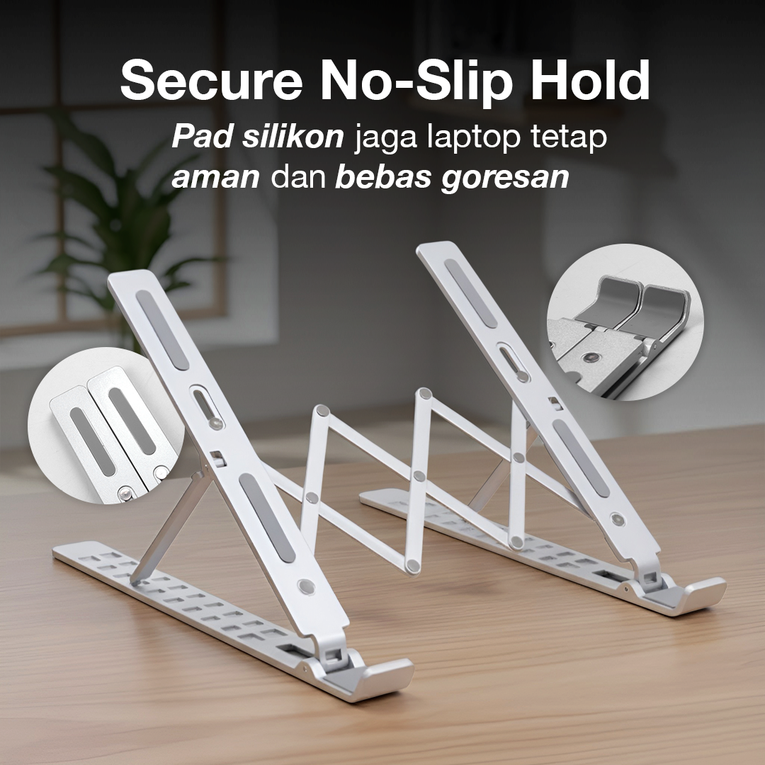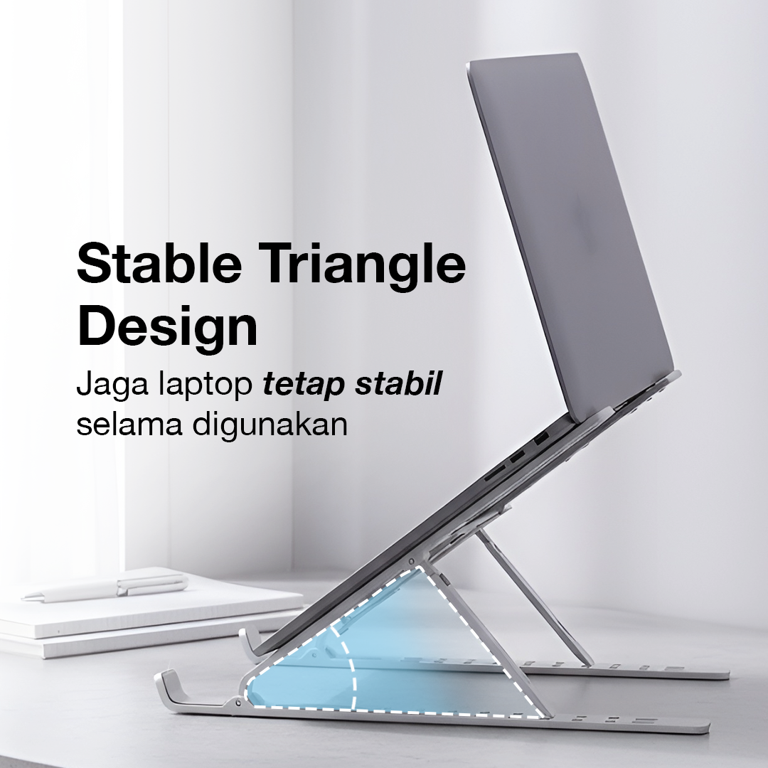 | Desain Ergonomis dan Stabil Desain ergonomis dengan kemiringan yang pas dan pad silikon anti slip dapat menopang laptop dengan maksimal. Ini yang memastikan stand laptop tetap stabil selama digunakan. |