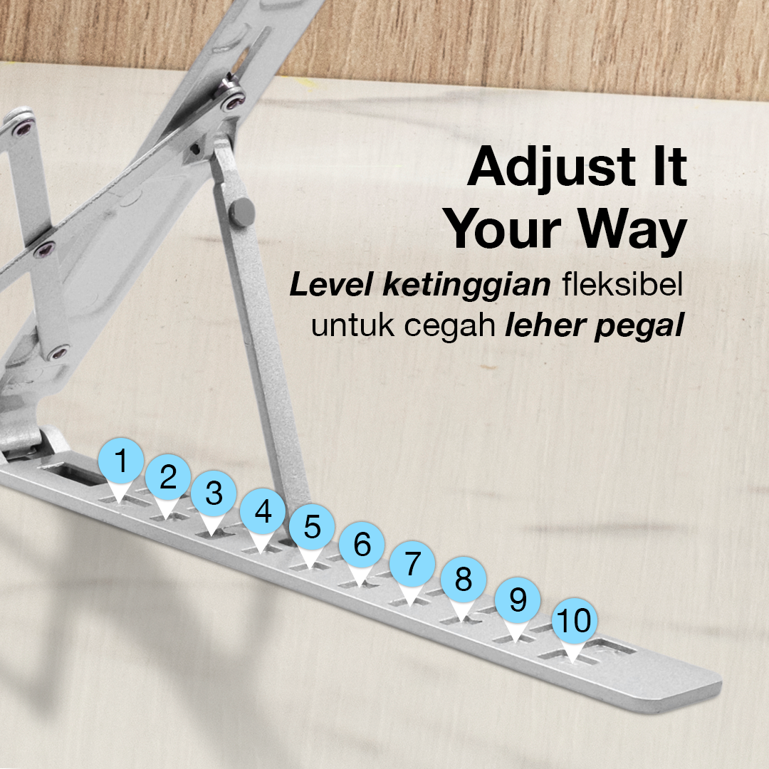 | Leher Bebas Pegal Menawarkan 10 level ketinggian, Anda dapat mengatur posisi laptop sesuai kebutuhan. Kini Anda bisa bekerja dengan nyaman tanpa khawatir leher pegal atau kaku meski dalam waktu yang panjang. |
