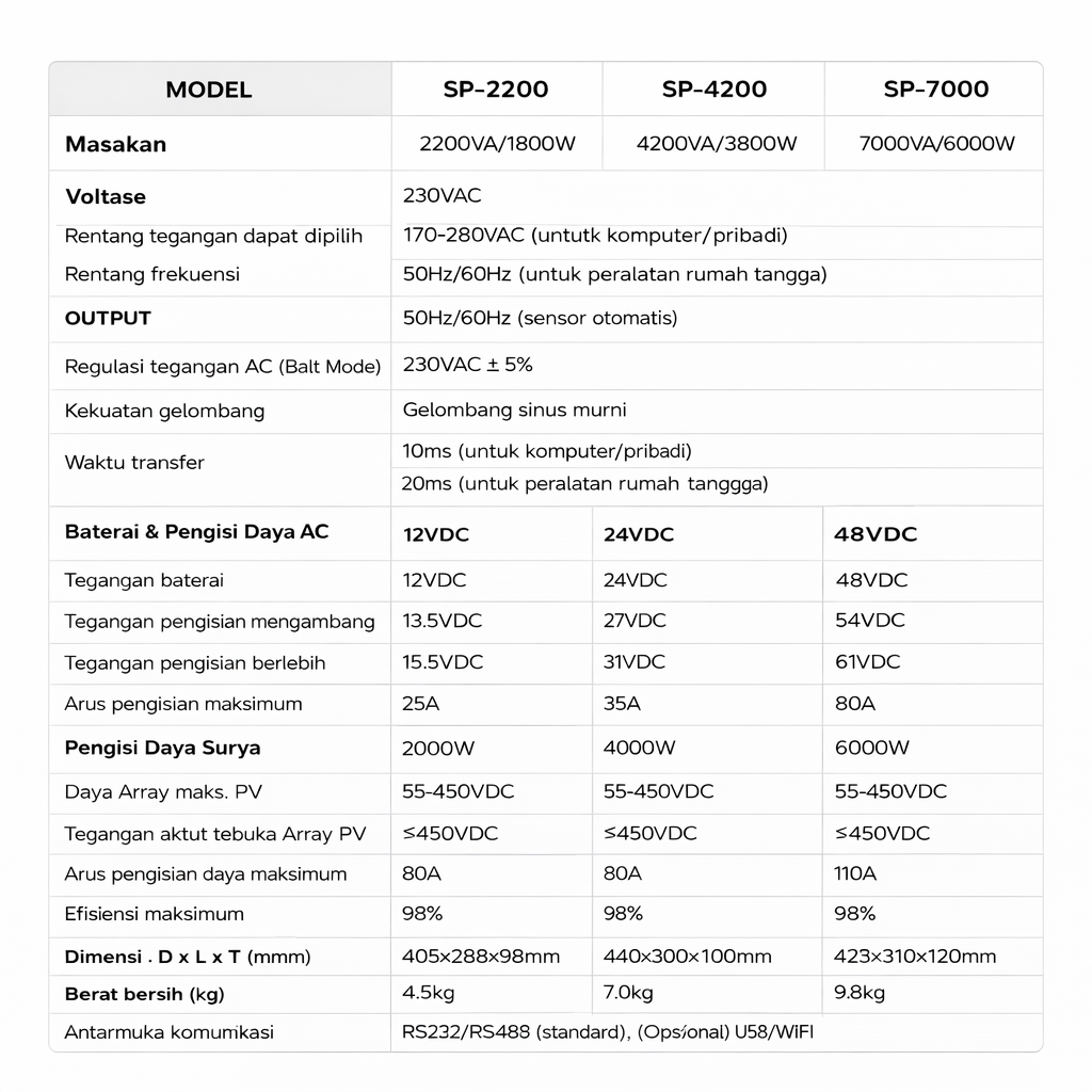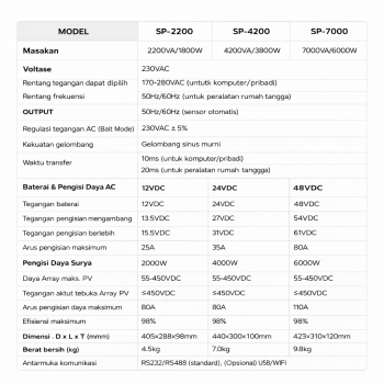 | Proteksi Keamanan Lengkap Dilengkapi perlindungan otomatis terhadap beban berlebih, panas berlebih, tegangan tinggi dan rendah, korsleting, arus berlebih serta kesalahan polaritas baterai. Inverter dan perangkat listrik tetap aman, stabil dan tahan lama. |
