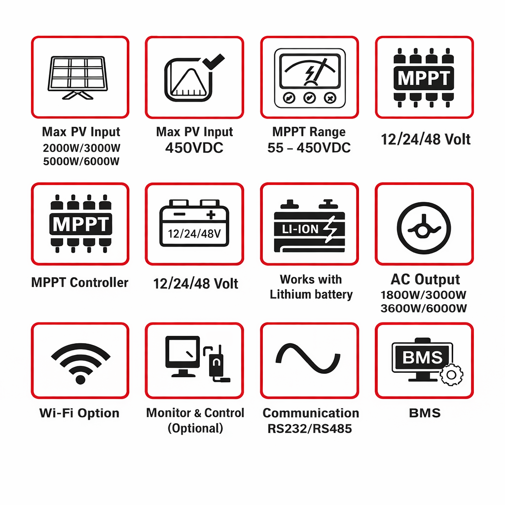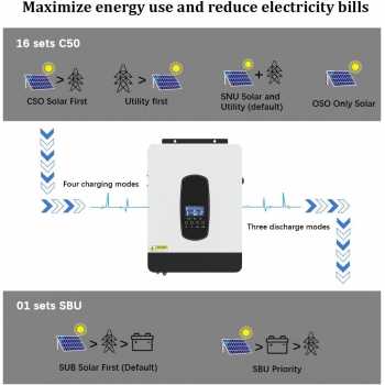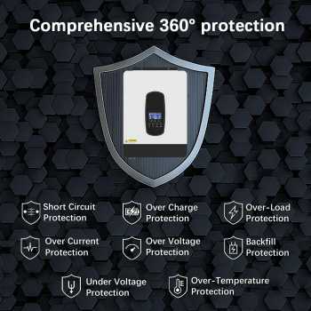 | Kontrol Daya Lebih Maksimal Selain sebagai inverter, alat ini juga dibekali teknologi MPPT yang berfungsi sebagai solar charge controller. Dengan teknologi tersebut, inverter mampu mengambil daya secara maksimum dari panel surya, juga mampu menyimpan kelebihan daya dan menyimpannya kembali ke dalam baterai. Voltase input yang dapat diterima dari panel surya juga luas, yakni DC 55 - 450 V. |