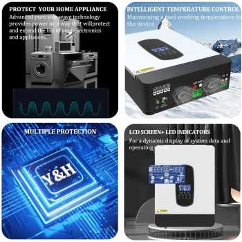 | Proteksi Keamanan Lengkap Dilengkapi perlindungan otomatis terhadap beban berlebih, panas berlebih, tegangan tinggi dan rendah, korsleting, arus berlebih serta kesalahan polaritas baterai. Inverter dan perangkat listrik tetap aman, stabil dan tahan lama. |