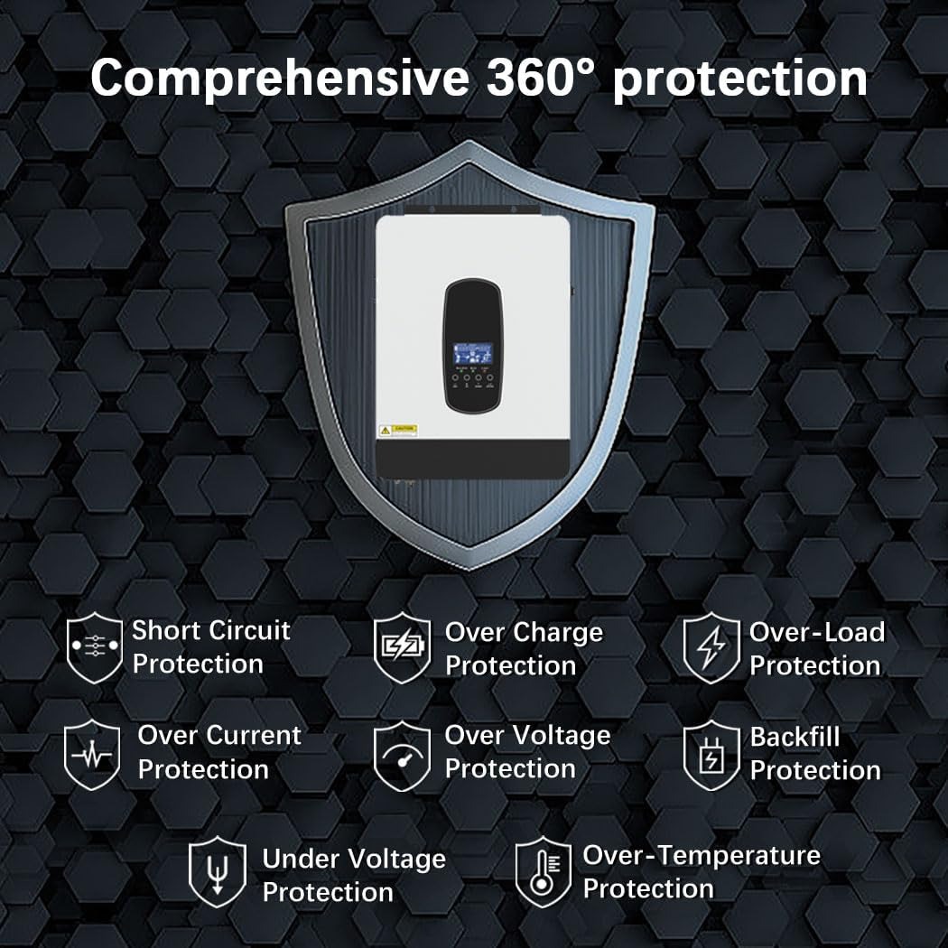 | Proteksi Keamanan Lengkap Dilengkapi perlindungan otomatis terhadap beban berlebih, panas berlebih, tegangan tinggi dan rendah, korsleting, arus berlebih serta kesalahan polaritas baterai. Inverter dan perangkat listrik tetap aman, stabil dan tahan lama. |