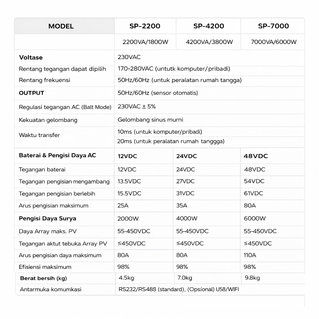 Inverter solar SP-2200 dari Y&H adalah solusi kontrol daya andal untuk sistem panel surya off-grid. Mengusung sistem hybrid, inverter ini berfungsi mengubah arus DC menjadi AC sekaligus mengoptimalkan pengisian daya dari panel surya. Dengan daya 1.8 kW (1800 W), inverter ini cocok untuk kebutuhan listrik rumah, kantor, UMKM, serta sebagai cadangan listrik saat pemadaman. Inverter ini mendukung sistem baterai 12 V untuk penyimpanan energi surya.