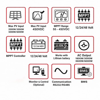 | Kontrol Daya Lebih Maksimal Selain sebagai inverter, alat ini juga dibekali teknologi MPPT yang berfungsi sebagai solar charge controller. Dengan teknologi tersebut, inverter mampu mengambil daya secara maksimum dari panel surya, juga mampu menyimpan kelebihan daya dan menyimpannya kembali ke dalam baterai. Voltase input yang dapat diterima dari panel surya juga luas, yakni DC 55 - 450 V. |