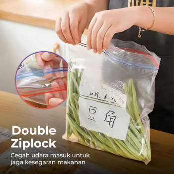 | Double Ziplock Aman Tutup dengan model double ziplock, kantong plastik makanan ini mencegah udara masuk untuk jaga kesegaran makanan lebih lama. Kini Anda bisa menyimpan makanan tanpa khawatir berjamur atau kadaluwarsa dengan food bag ziplock dari YIXIN. |