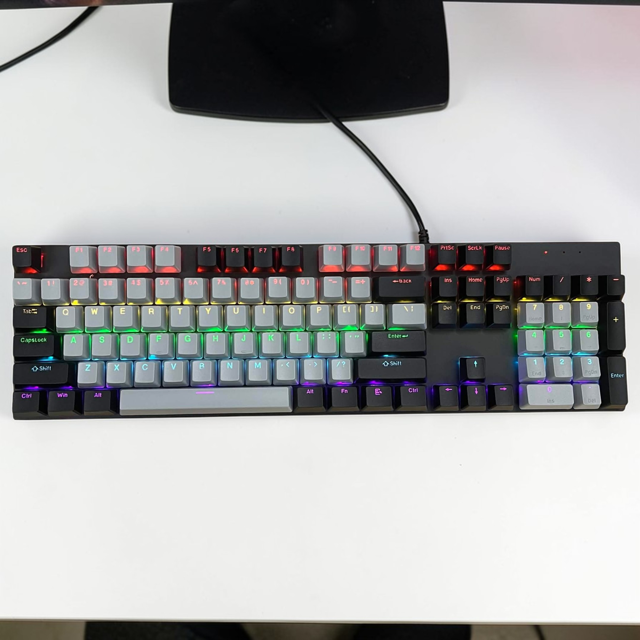 | Layout Full Size Lengkap Keyboard ini menggunakan layout full size 104 keys dengan numpad lengkap, tombol function row, serta cluster navigasi penuh. Konfigurasi ini sangat ideal untuk gamer yang membutuhkan macro tambahan, pengguna spreadsheet, programmer, maupun pekerja kantoran yang sering menggunakan numeric input. |