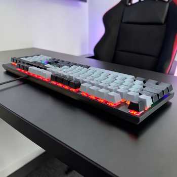 | Blue Switch, Feedback Akurat Menggunakan blue switch mechanical feel yang menghadirkan tactile bump jelas dan suara clicky khas mechanical keyboard. Sensasi ini memberikan feedback akurat setiap kali tombol ditekan, membantu meningkatkan presisi saat gaming dan mengurangi typo saat mengetik cepat. Cocok untuk pengguna yang menyukai karakter switch yang responsif dan tegas. |