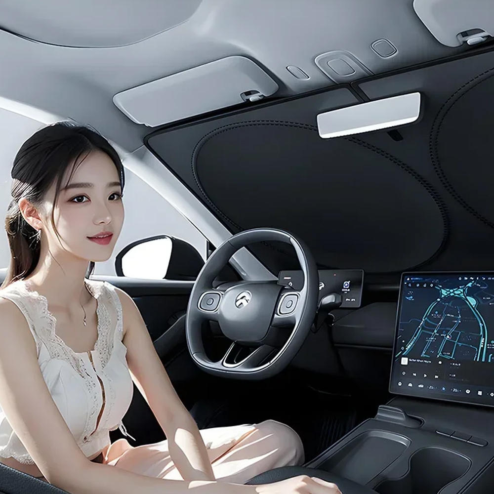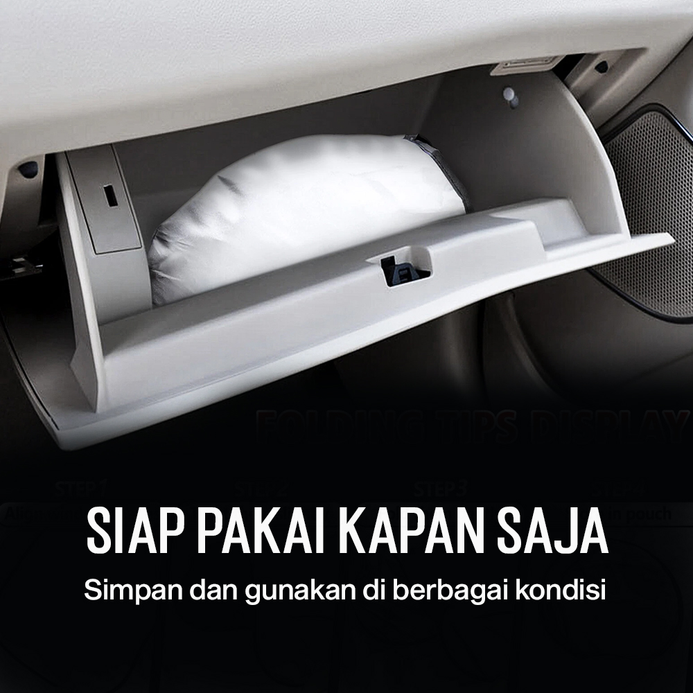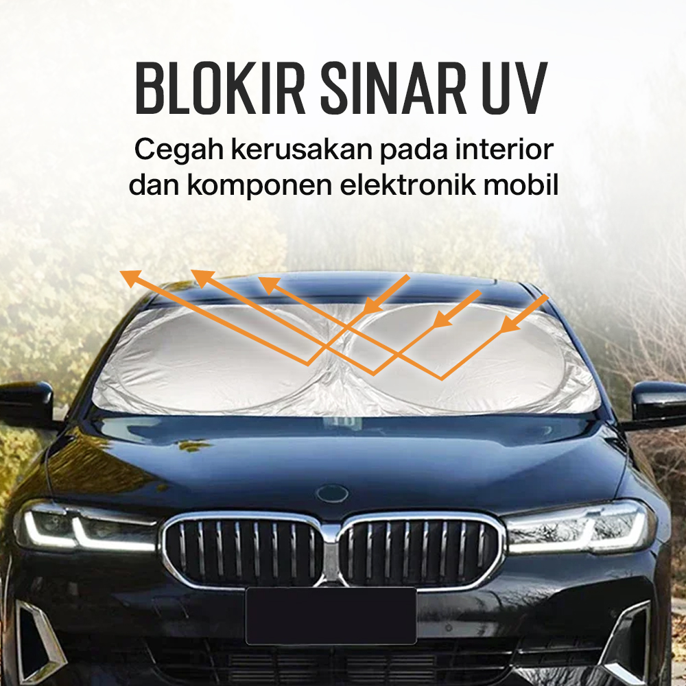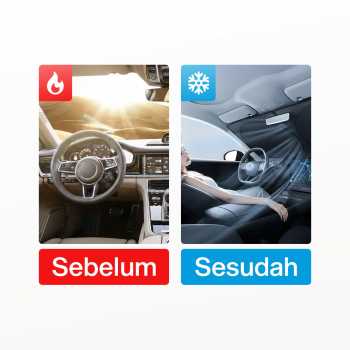 | Material Poliester Reflektif Metalik Menggunakan bahan poliester reflektif metalik yang mampu memantulkan sinar matahari secara optimal. Membantu menurunkan suhu kabin dan melindungi dashboard serta interior kendaraan. |