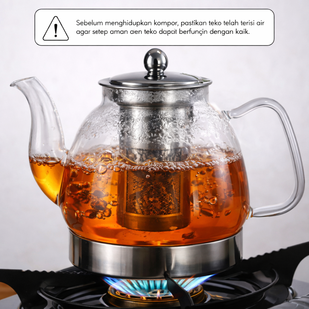 | Tahan Panas Teko pitcher ini terbuat dari bahan kaca borosilikat yang tahan panas sehingga tidak perlu takut pecah akibat dituang air bersuhu tinggi. Selain bahan kaca borosilikat terdapat bahan stainless steel 304 yang kokoh dan aman digunakan. Teko ini juga dapat dipanaskan langsung menggunakan kompor api ataupun listrik. Perlu diperhatikan agar mengisi air terlebih dahulu sebelum memanaskan teko, jika teko dalam keadaan kosong saat pemanasan maka dapat menyebabkan kaca retak. |