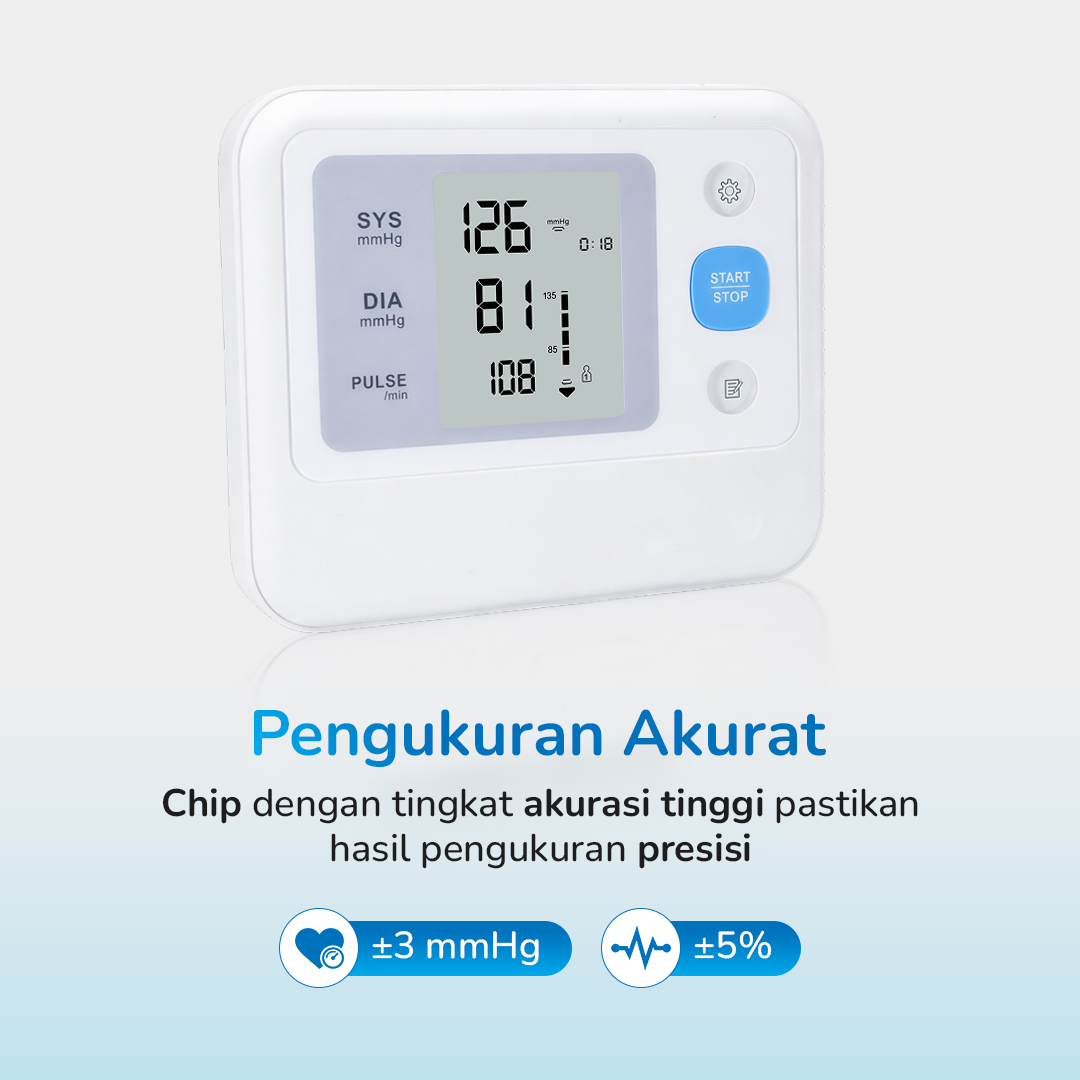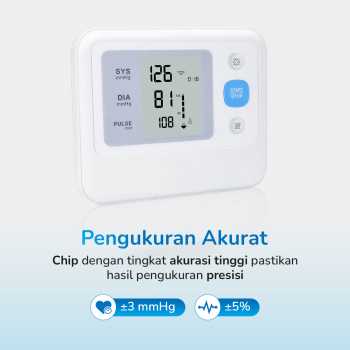 | Pengukuran Akurat Hasil pengukuran tetap terjaga akurasinya berkat chip pengukuran digital yang punya tingkat akurasi tinggi hingga 3 mmHg untuk tekanan darah dan 5% untuk denyut nadi. |