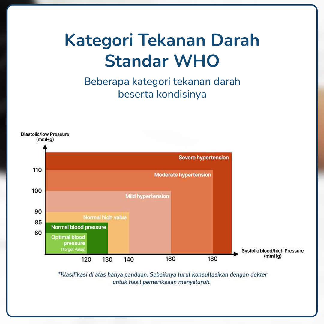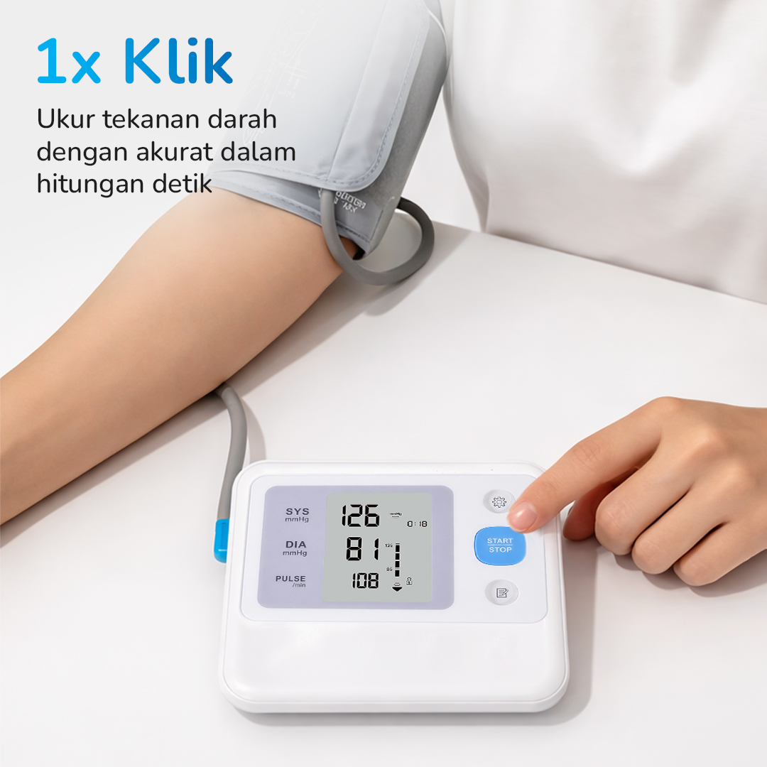 | 1x Klik Praktis Tak perlu repot mengatur mode penggunaan lagi. Cukup 1x klik dan Anda bisa menggunakan tensimeter digital untuk mengukur tekanan darah dalam hitungan detik. |