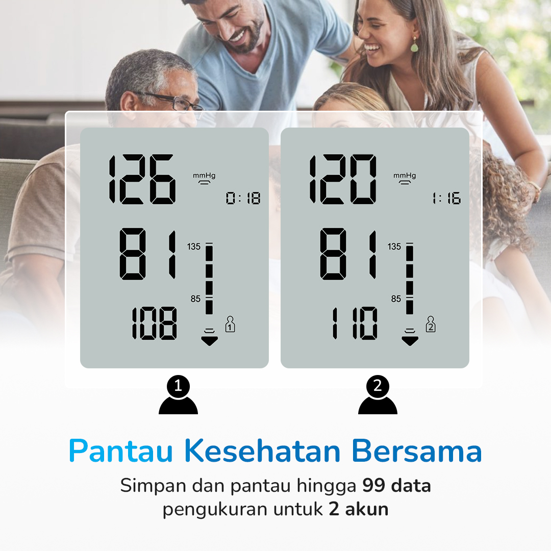 | Pantau Kesehatan Bersama Memantau data tekanan darah kini lebih mudah berkat adanya fitur penyimpanan data. Kini Anda bisa memonitor hingga 99 data pengukuran untuk 2 akun yang cocok digunakan bersama keluarga. |