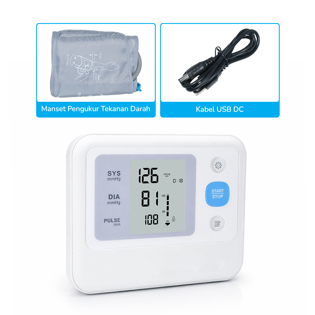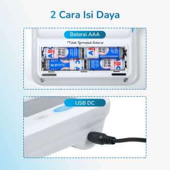 | 2 Cara Isi Daya Tak perlu khawatir kehabisan daya. Tensimeter ini punya 2 cara pengisian daya, yakni baterai AA dam kabel USB DC. Cocok untuk digunakan di rumah atau dibawa selama traveling. |