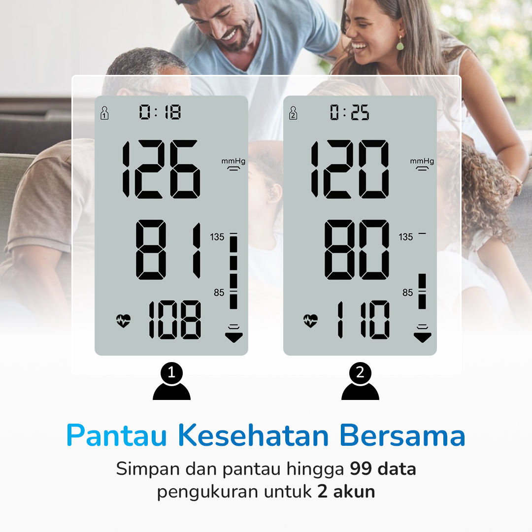| Pantau Kesehatan Bersama Memantau data tekanan darah kini lebih mudah berkat adanya fitur penyimpanan data. Kini Anda bisa memonitor hingga 99 data pengukuran dari 2 akun berbeda yang cocok digunakan bersama keluarga. |