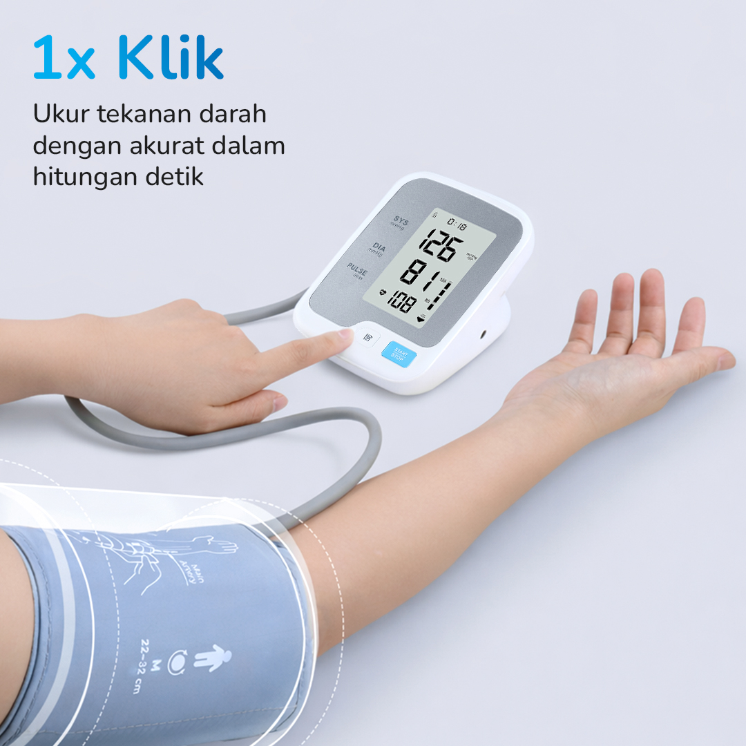 | 1x Klik Praktis Tak perlu repot mengatur mode penggunaan lagi. Cukup 1x klik dan Anda bisa menggunakan tensimeter digital untuk mengukur tekanan darah dalam hitungan detik. |