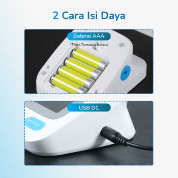 | 2 Cara Isi Daya Tak perlu khawatir kehabisan daya. Tensimeter ini punya 2 cara pengisian daya, yakni baterai AA dam kabel USB DC. Cocok untuk digunakan di rumah atau dibawa selama traveling. |