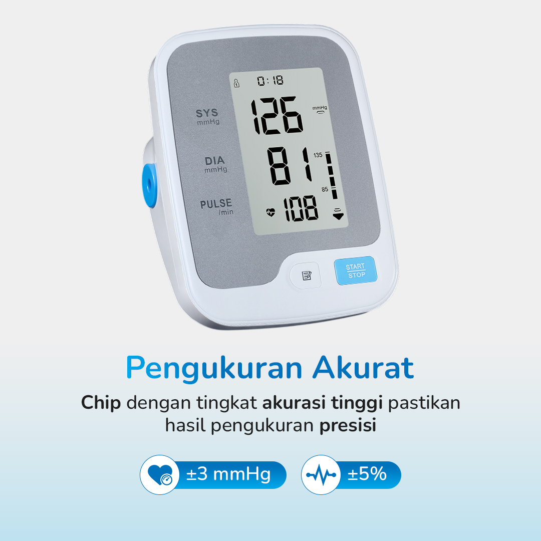 | Pengukuran Akurat Hasil pengukuran tetap terjaga akurasinya berkat chip pengukuran digital yang punya tingkat akurasi tinggi hingga 3 mmHg untuk tekanan darah dan 5% untuk denyut nadi. |