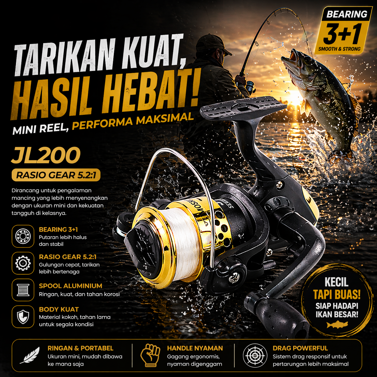 Sedang mencari reel pancing spinning yang ringan, halus, dan cocok untuk penggunaan harian? YUMOSHI JL200 fishing reel hadir sebagai pilihan tepat untuk pemancing pemula maupun penghobi yang membutuhkan reel pancing praktis dengan harga terjangkau. Dibekali rasio gear 5.2:1 dan sistem 3+1 ball bearing, reel ini memberikan putaran lancar serta kontrol nyaman saat strike ikan. Cocok digunakan di kolam, sungai, dan perairan ringan.