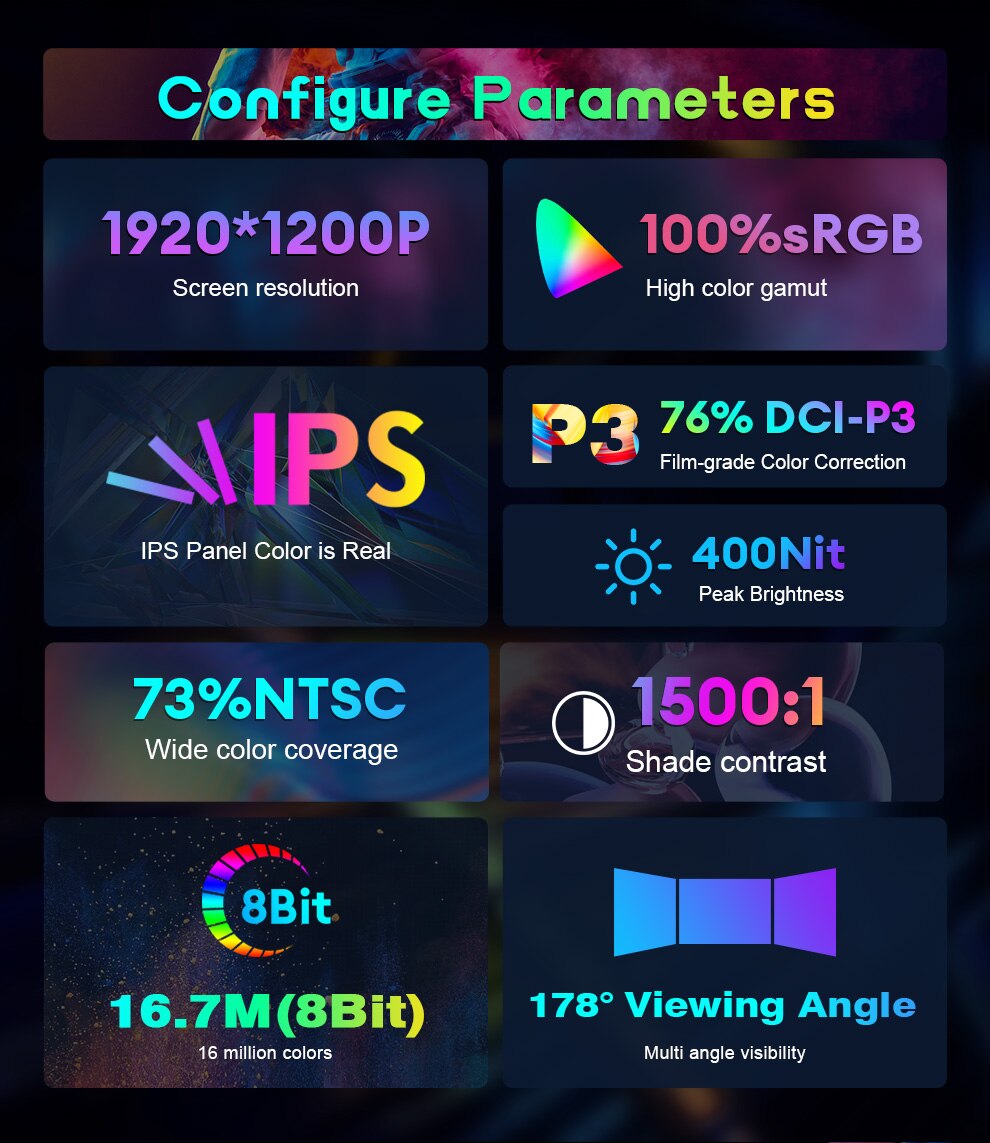 | Tampilan Jernih Resolusi Tinggi Dengan resolusi 1920 x 1200 pixels, monitor portable ini menawarkan keunggulan visual yang superior, memberikan kualitas gambar yang lebih tinggi, ruang kerja yang lebih luas, dan pengalaman multimedia yang lebih memuaskan. Cocok Anda gunakan untuk keperluan editing video, desain, hingga gaming. |