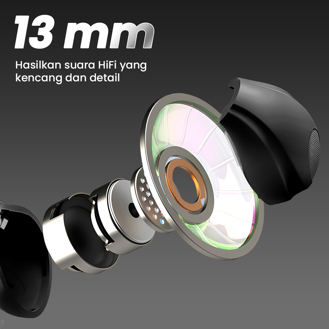 | Suara Kencang dan Detail Driver 13 mm hasilkan suara dengan kualitas HiFi yang kencang dan detail. Anda bisa mendengar musik yang detail dan jernih lengkap dengan bass kencang untuk temani berbagai aktivitas. |