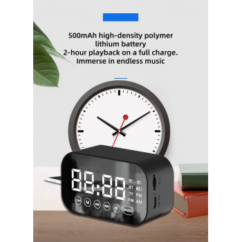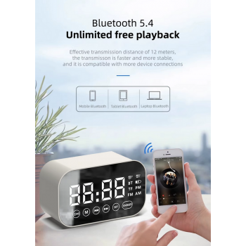 ZIKY adalah speaker Bluetooth portabel dengan jam alarm digital, slot TF dan radio FM. Ditenagai baterai lithium 500 mAh isi ulang dan port USB Type C untuk pengisian cepat. Desain mini ringan membuatnya praktis dibawa ke mana saja, cocok untuk musik, panggilan, dan alarm harian.
