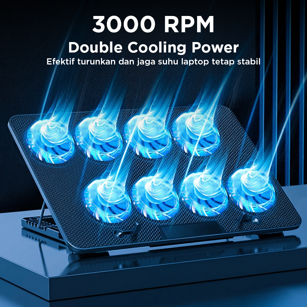 | Laptop Dingin Merata 8 Kipas dengan kecepatan hingga 3000 RPM sebarkan udara dingin secara merata ke seluruh permukaan laptop. Efektif turunkan dan jaga suhu laptop agar tetap stabil saat menjalankan game berat sekalipun. |