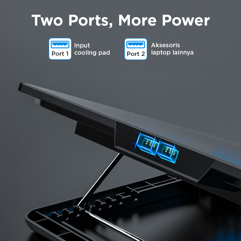 | Dual Port Multitasking 2 Port USB membuat Anda tetap bisa menggunakan cooling pad dan aksesors laptop lain, seperti mouse atau flashdisk secara bersamaan. Tanpa perlu menggunakan konektor tambahan. |