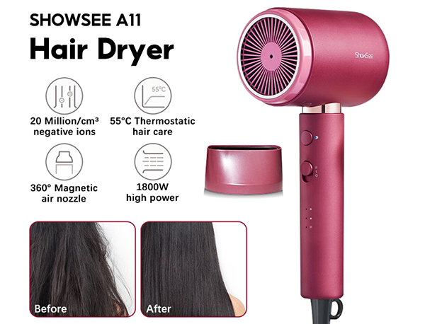 Rambut yang sulit diatur memang menyebalkan. Inilah saatnya untuk menggunakan hair dryer A11-R dari ShowSee. Mengeringkan dan menata rambut jadi makin mudah berkat bilah kipasnya yang mampu menghasilkan volume angin besar dan minim suara. Udara panas atau dingin yang dihasilkan juga stabil. Mengadopsi teknologi ion negatif, hair dryer ini siap menjaga kesehatan rambut, serta membuatnya berkilau dan halus.