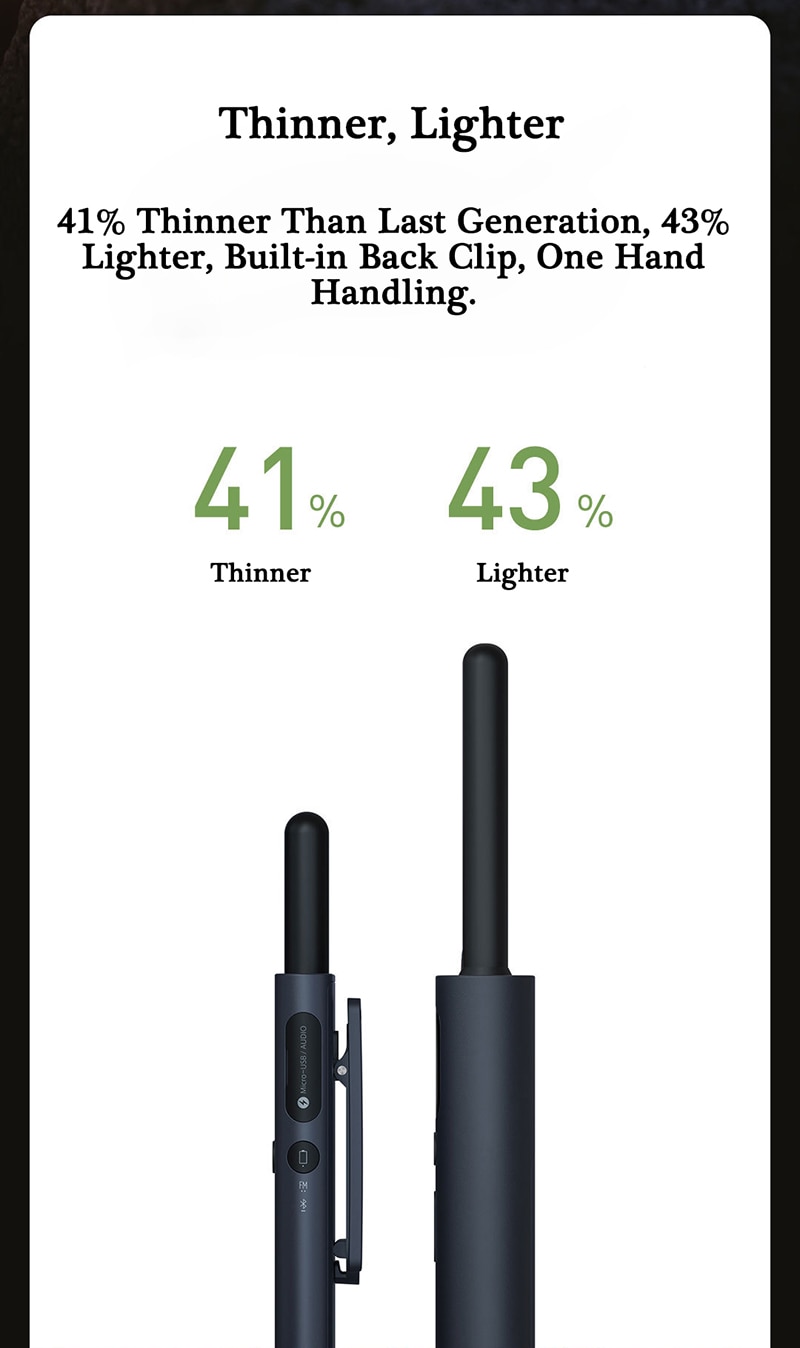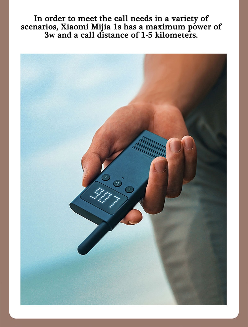 | Desain Tipis dan Premium Xiaomi Mijia 1S hadir dengan desain yang ramping dan elegan, menjadikannya berbeda dari walkie talkie konvensional. Dengan warna netral dan tampilan modern, perangkat ini cocok digunakan oleh siapa saja, baik dalam aktivitas sehari-hari maupun kegiatan outdoor. Bentuk yang tipis membuatnya mudah dibawa, dimasukkan ke dalam saku, atau digantung di sabuk tanpa membebani.
